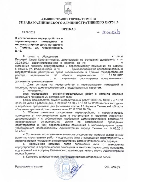 Здравствуйте! Меня зовут Ольга Петрова - я руководитель Единого центра перепланировок в городе Тюмень.